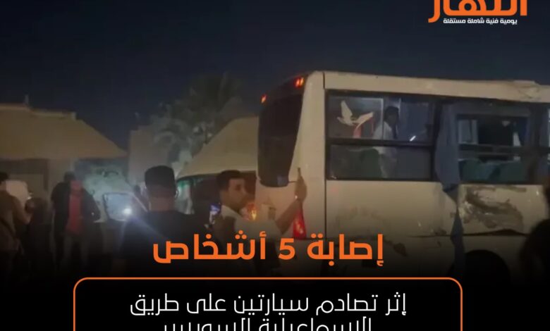 إصابة 5 أشخاص إثر تصادم سيارتين على طريق الإسماعيلية السويس