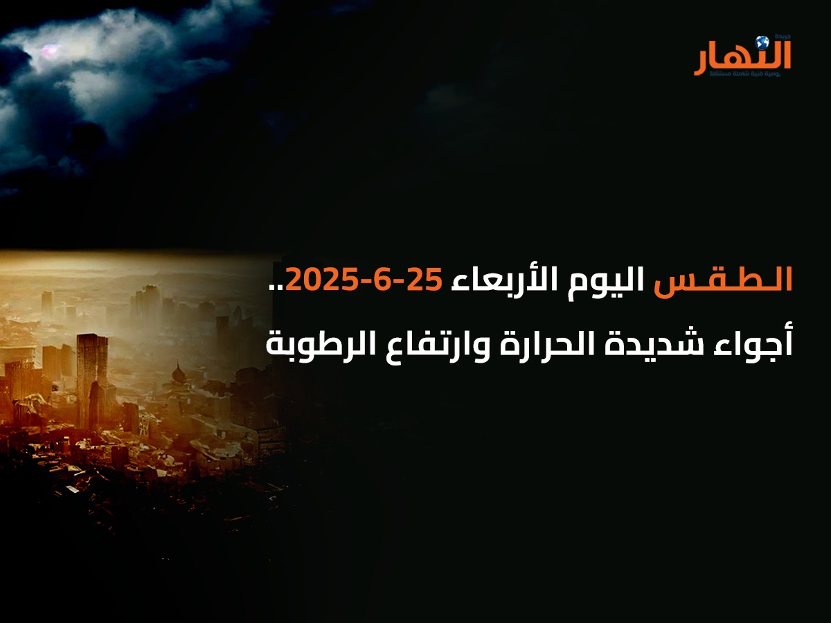 تتوقع الهيئة العامة للأرصاد الجوية، أن يشهد اليوم الأربعاء 25 يونيو 2025، يسود طقس حار إلى شديد الحرارة رطب نهارًا على أغلب الأنحاء، مائل للحرارة رطب على السواحل الشمالية معتدل الحرارة ليلًا وفى الصباح الباكر.