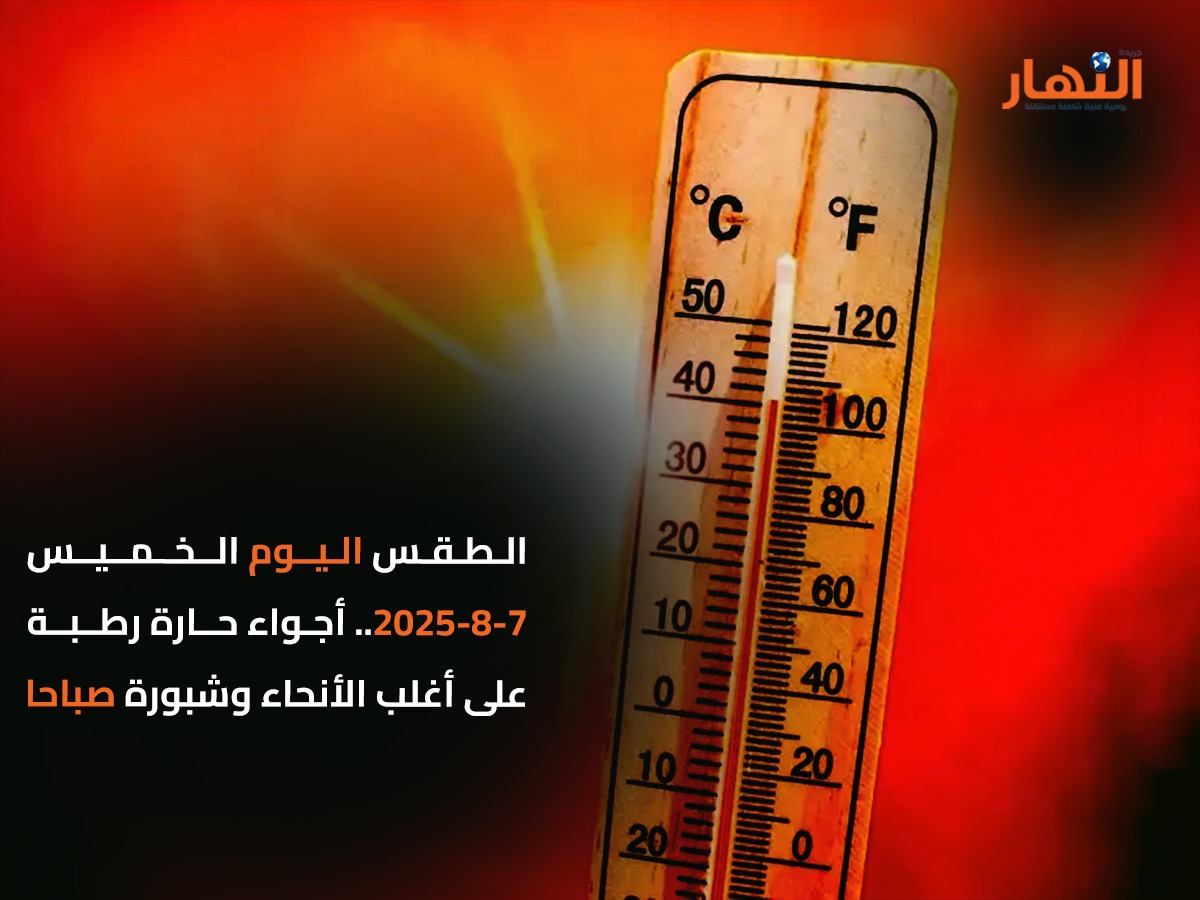 تتوقع الهيئة العامة للأرصاد الجوية، أن يشهد اليوم الخميس 7 أغسطس، يسود طقس حار رطب نهارًا على أغلب الأنحاء شديد الحرارة رطب على جنوب سيناء وجنوب البلاد مائل للحرارة رطب ليلًا وفى الصباح الباكر.