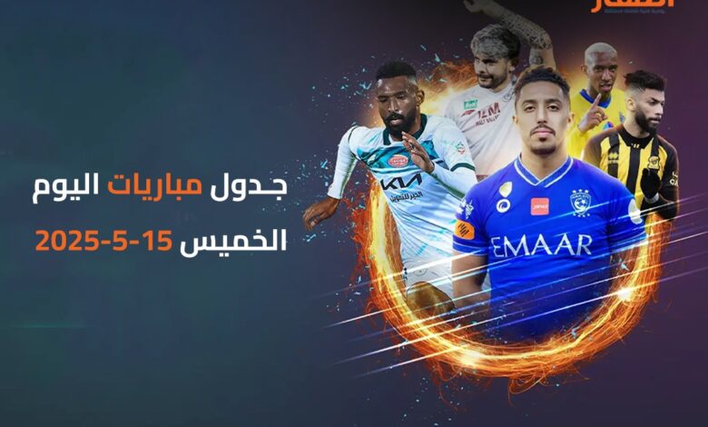 يشهد اليوم الخميس 15-5-2025العديد من المبارايات المحلية والدولية إليك أبرز المباريات:-