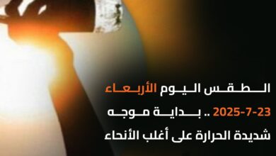 كتب – محمود راغب تتوقع الهيئة العامة للأرصاد الجوية، أن يشهد اليوم الأربعاء 23 يوليو، بداية موجة شديدة الحرارة على…