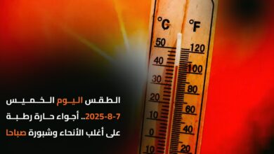 تتوقع الهيئة العامة للأرصاد الجوية، أن يشهد اليوم الخميس 7 أغسطس، يسود طقس حار رطب نهارًا على أغلب الأنحاء شديد…